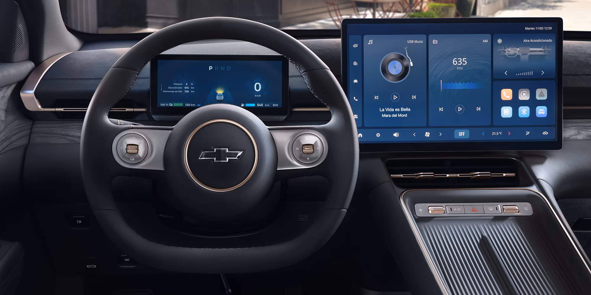 Volante cubierto de piel sintética con emblema Chevrolet en negro al centro.